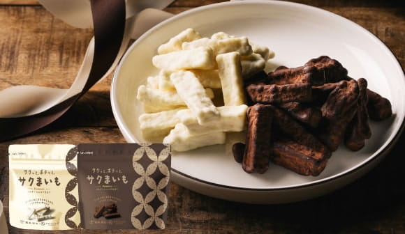 《2/14はチョコレートの日》サクっと食感の芋けんぴ「サクまいも」に、チョコレートをコーティング。2種類のチョコレートのとろける優しい甘さをぜひ食べ比べてみてください。
