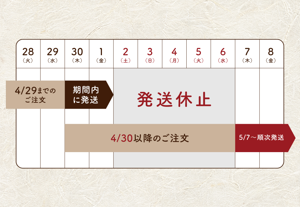 インターネットからのご注文は休業期間中も24時間受付けておりますが、休業中にいただいたご注文やお問い合わせへの対応は、5月7日(木)より順次再開となります。